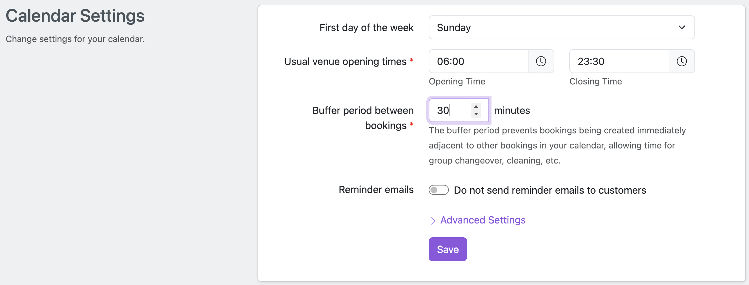 To define your buffer period, click click Settings in the navigation bar then click on Calendar Settings. Within the Calendar Settings pane, enter the buffer period and then click Save.