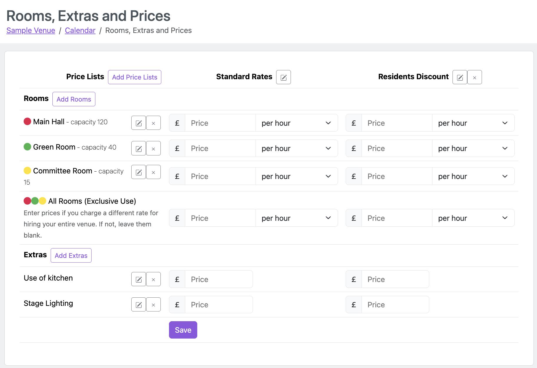 - Extras - these are additional charges you may wish to associate with bookings such as Use of Kitchen, Alcohol Licence, etc.
