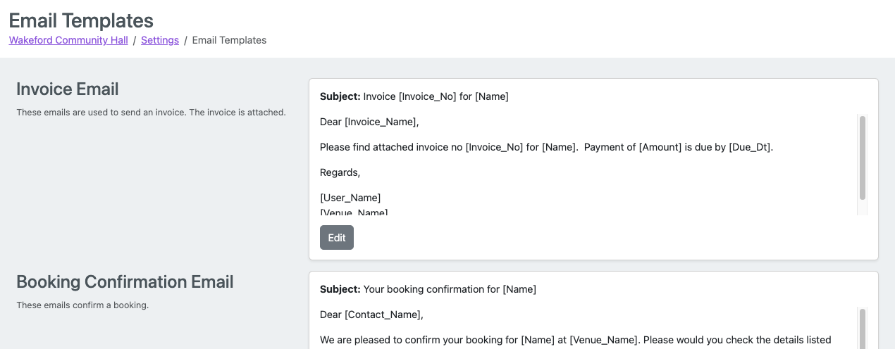 To access email template customisation, navigate to the Settings icon in the navigation bar and select Email Templates. Each template appears as a card with an Edit button that opens an editor for subject lines and message body content.