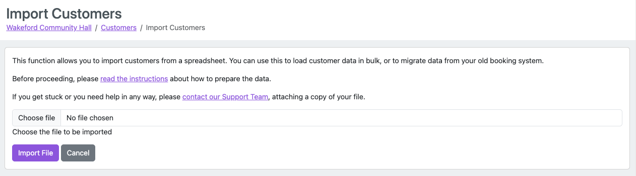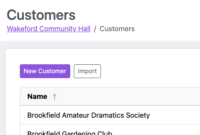 You can import customer data from an Excel spreadsheet. This is useful for bulk loading customer information or migrating from a previous booking system.Note: Venue Account Owners and Venue Administrators can import data. If you do not see the Import button, you may not have the required permissions.