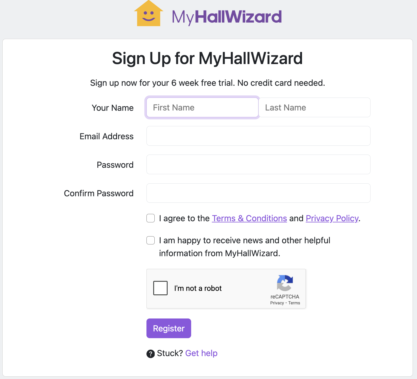 Go to https://app.myhallwizard.com/register and complete the registration form: